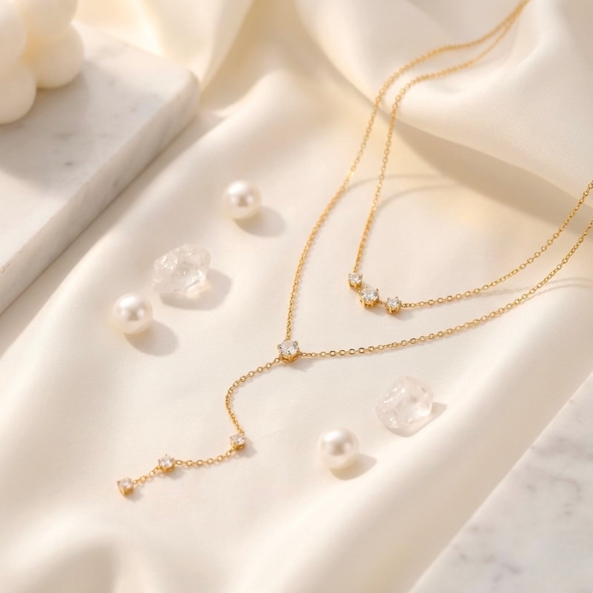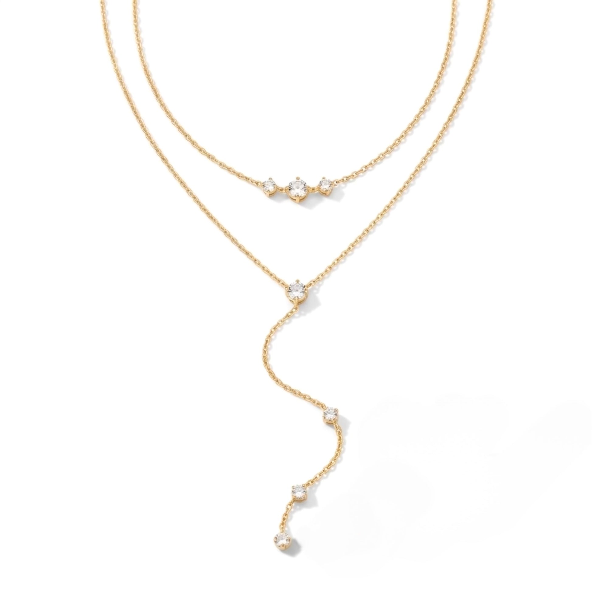 Questa elegante collana presenta un design a strati con due delicate catene adornate da piccoli diamanti scintillanti. La catena più corta ha tre piccole pietre simili a diamanti posizionate in modo uniforme, mentre la catena più lunga pende con una pietra più grande al centro, creando un effetto a goccia sottile ma elegante. Il suo design delicato e gli accenti scintillanti la rendono un pezzo versatile che può essere indossato casualmente o con un abbigliamento più formale.