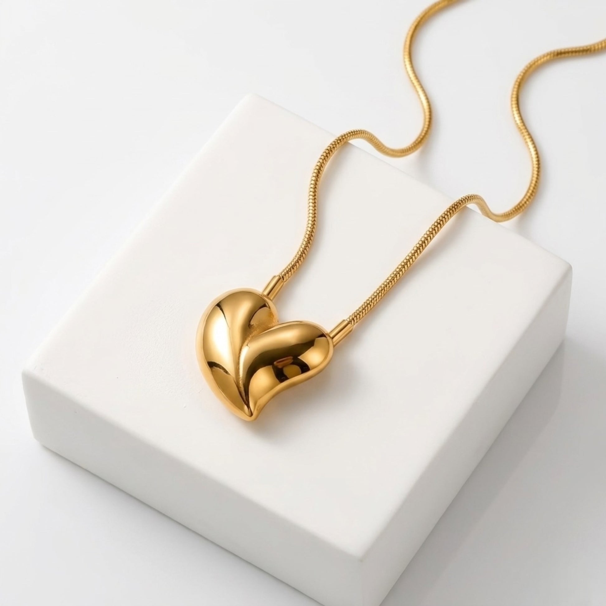 Questa collana presenta un ciondolo liscio a forma di cuore, scultoreo, che emana una sensazione di modernità e lusso. La tonalità lucida dell'oro ne esalta l'eleganza, mentre il design elegante e minimale, senza decorazioni aggiuntive, la fa risaltare nella sua semplicità.