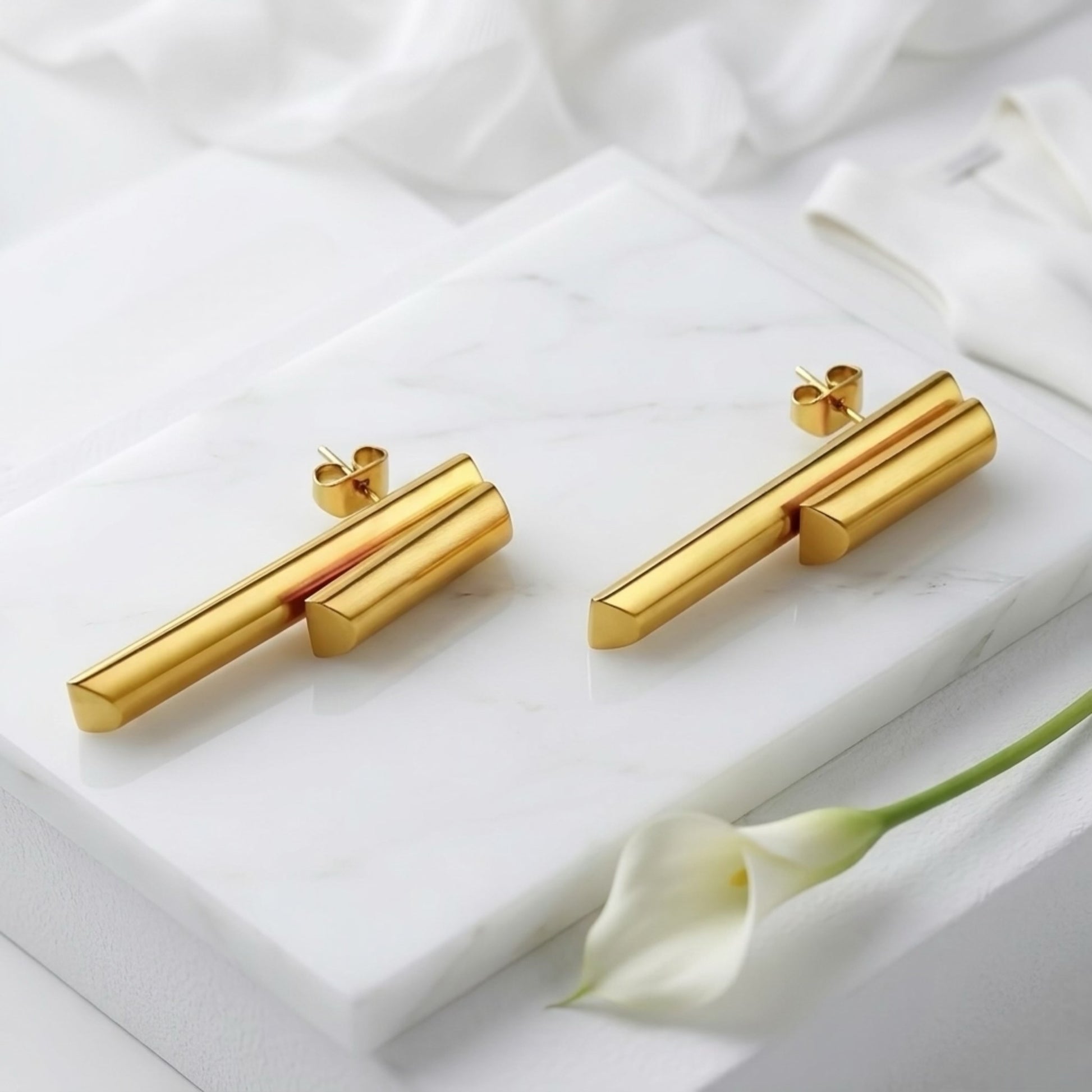 This earring from the BEHI Collection, inspired by architectural style and modern design, features clean, precise lines that give your look a chic and stylish touch. Its design beautifully merges architectural art with contemporary beauty, adding a unique and distinctive flair to your appearance.