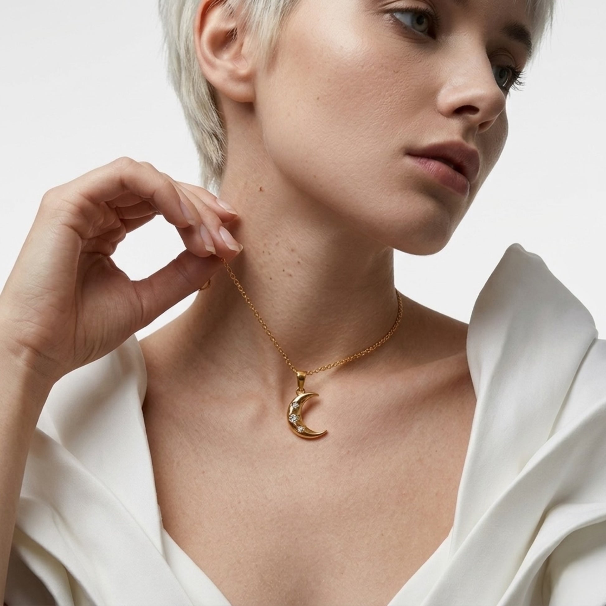This necklace features a delicate crescent moon pendant adorned with small stars, making it both mystical and elegant. The shiny gold plating contrasts beautifully with the clear rhinestones, adding a touch of sparkle that catches the light. It’s the perfect accessory for someone who enjoys subtle celestial symbolism or wishes to add a unique yet refined element to their outfit.